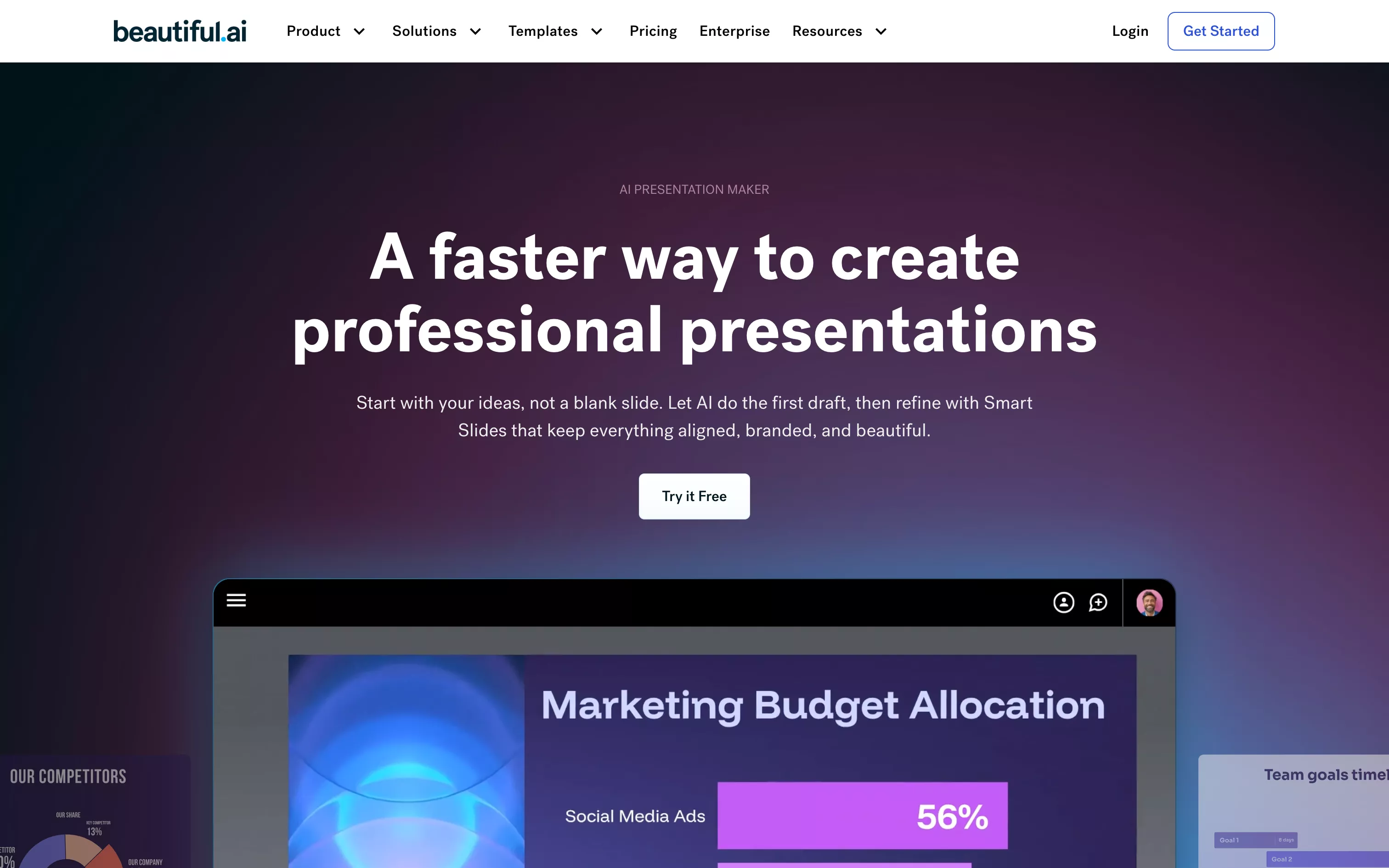 Beautiful AI est un outil de présentation intelligent qui met automatiquement en page vos idées avec un rendu professionnel. Il adapte la disposition, la typographie et les visuels pour créer des slides harmonieuses et percutantes. Parfait pour les pitch decks, rapports ou présentations clients.