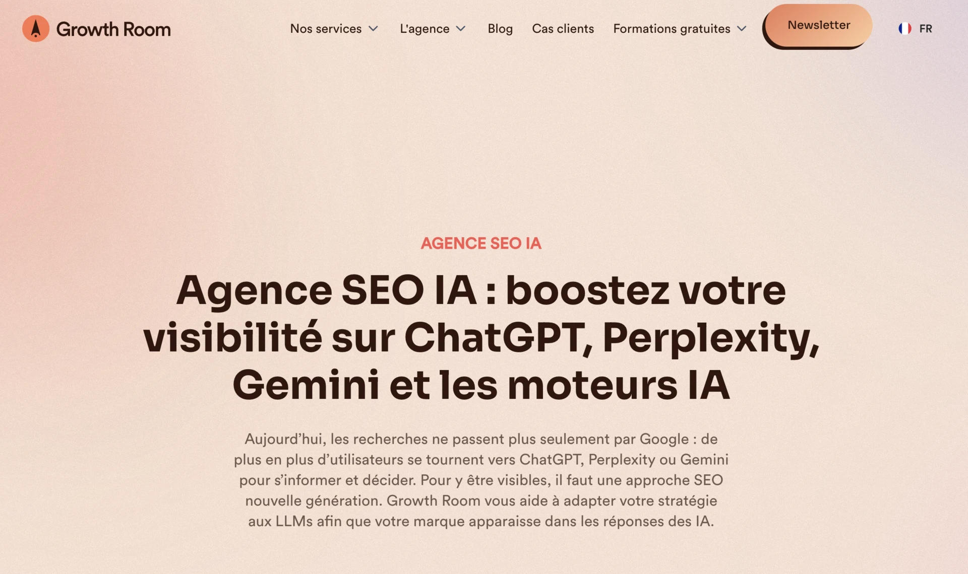 Agence fondée en 2020, Growth Room conçoit des gabarits de pages simples à répliquer, standardise le maillage interne et produit des contenus pensés pour les lecteurs, pour Google et pour les assistants d’IA, avec relecture humaine systématique. Le tout s’inscrit dans un cadre mesurable qui relie les pages au pipeline commercial. L’agence accompagne et applique leur approche SEO pour l’IA, notamment Devialet, Roche Bobois, PrestaShop, ManoMano et Veolia.
