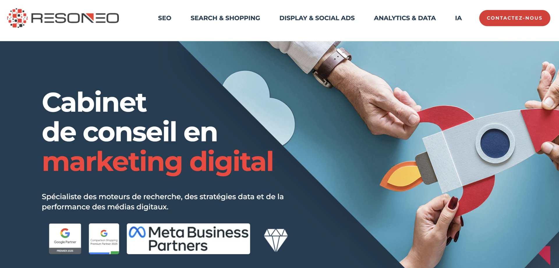 Pourquoi les appeler : acteur français installé, positionné performance avec un vrai historique e-commerce et leadgen. Certifiée Google Premier Partner selon leur présentation officielle, ce qui atteste d’un niveau d’expertise et de volumes gérés.