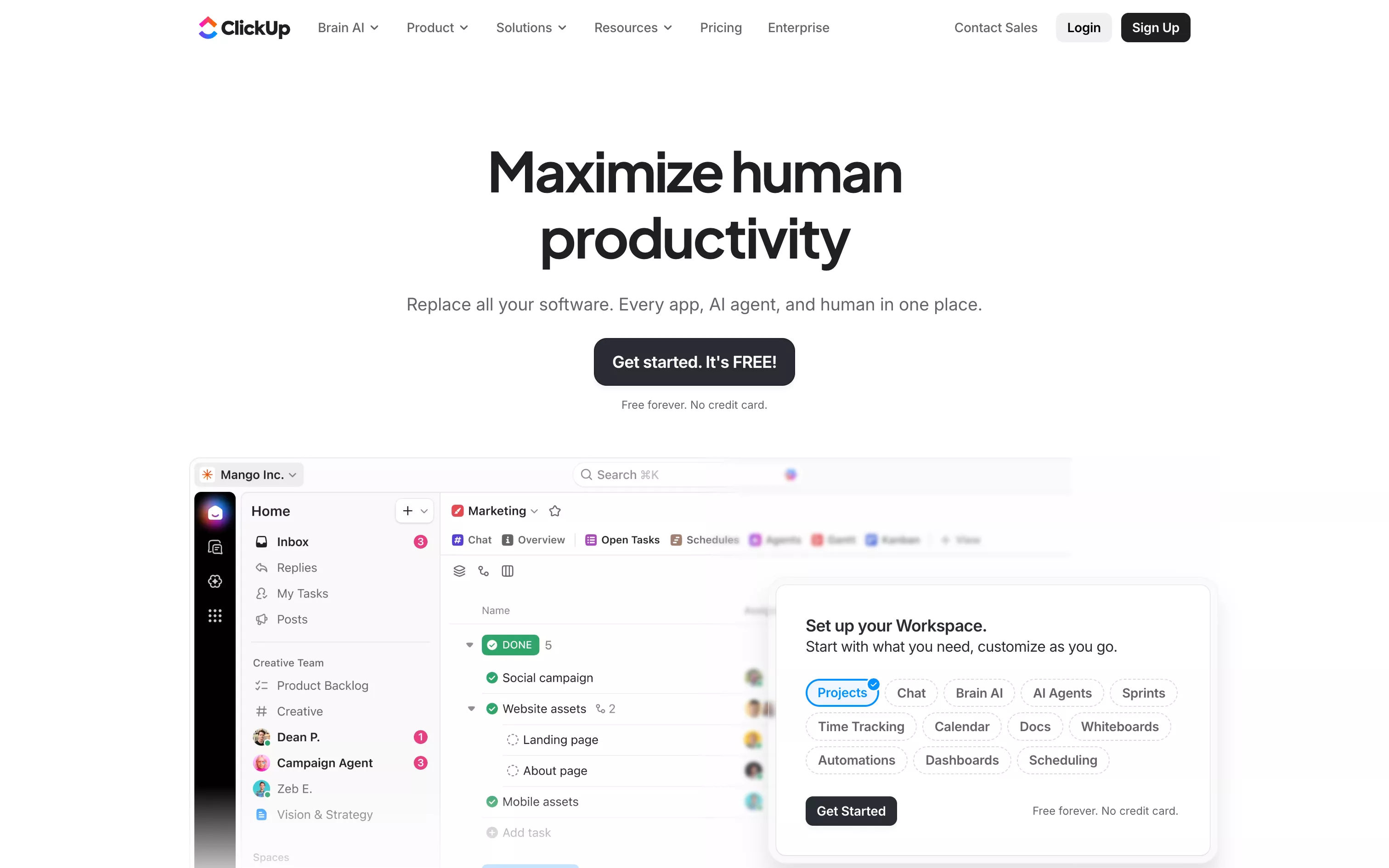 ClickUp se présente comme un véritable hub universel de productivité. Pensé pour centraliser la collaboration, la planification, la documentation et le suivi de projets, il s’adapte à toutes les méthodes de travail, que ce soit agile, marketing, design, service ou produit. Grâce à une hiérarchie modulable (Spaces, Folders, Lists), chaque équipe peut structurer son espace selon ses besoins.