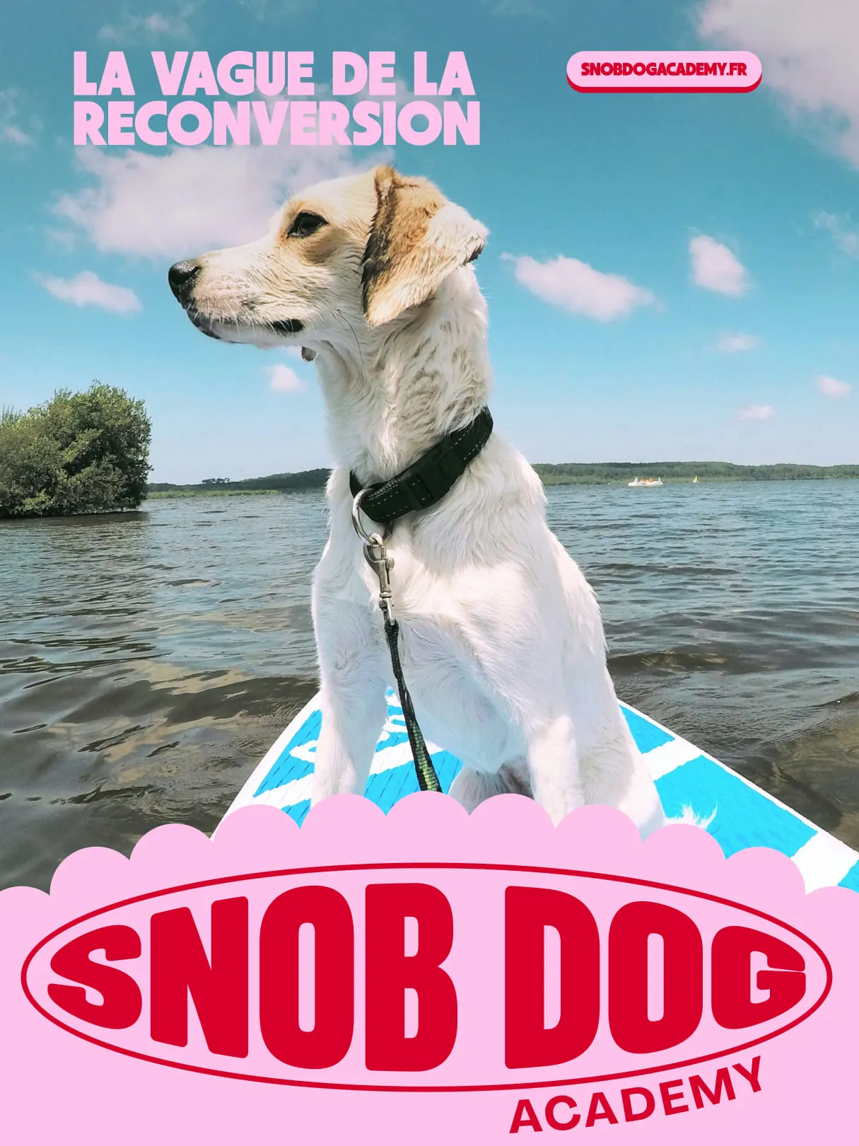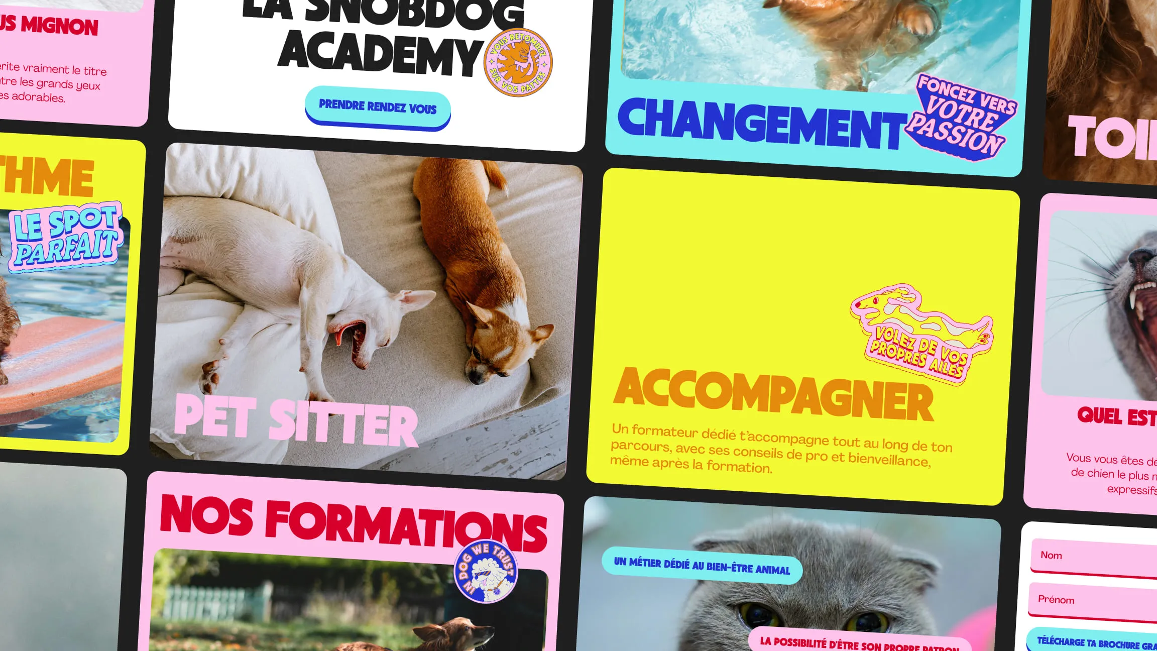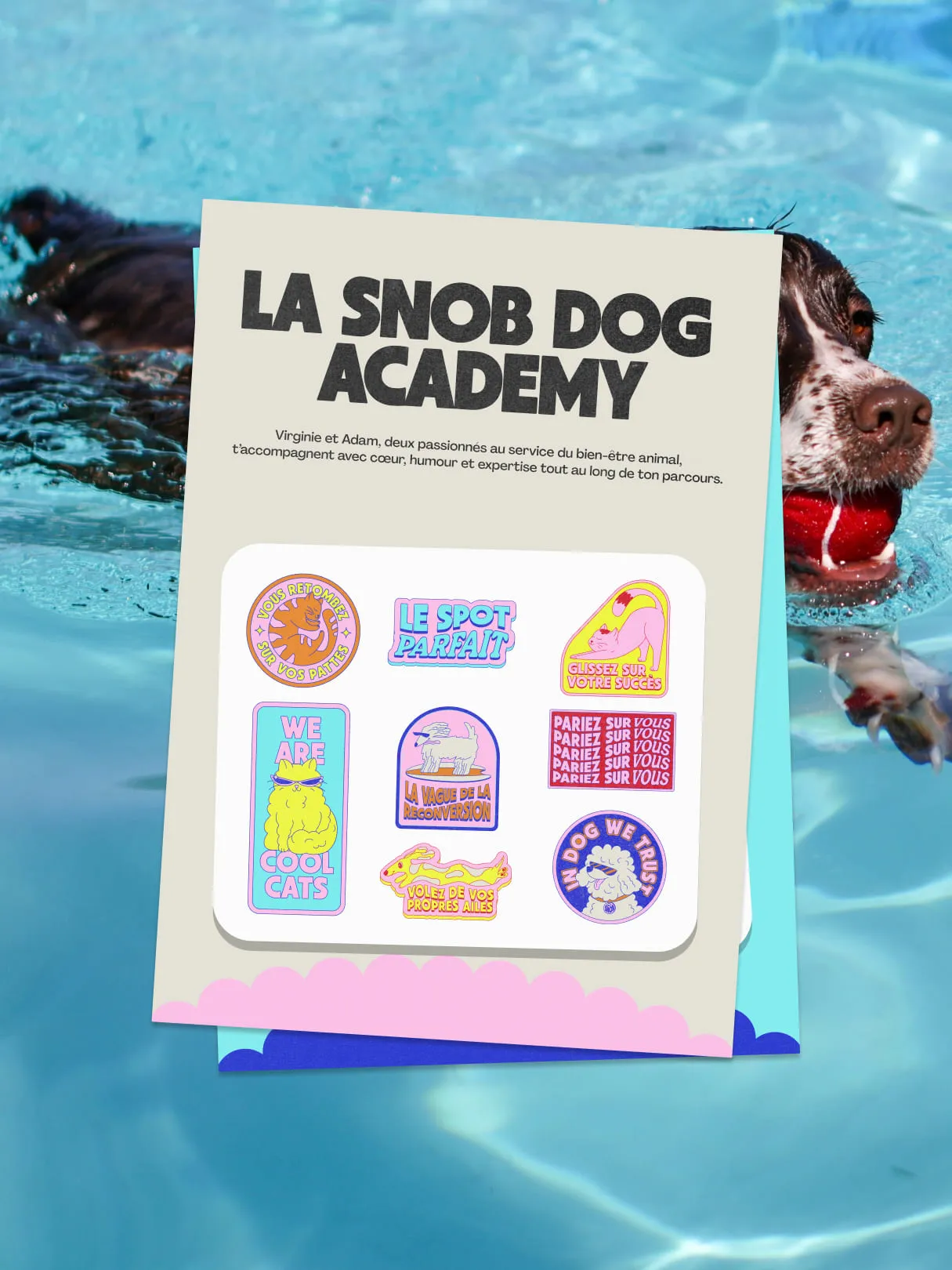 Nous avons démarré par le fond : qu'est-ce qui distingue vraiment Snob Dog ? Quelle promesse unique ? La réponse : le bien-être des animaux ET des entrepreneurs. Pas de fausse opposition entre passion animale et réussite commerciale. Cette double exigence nous a guidés vers une métaphore centrale — le coach de surf. Celui qui accompagne la vague, enseigne l'équilibre, rend autonome. Cette clarté conceptuelle a libéré le reste : identité verbale, identité visuelle, tout découlait naturellement.
